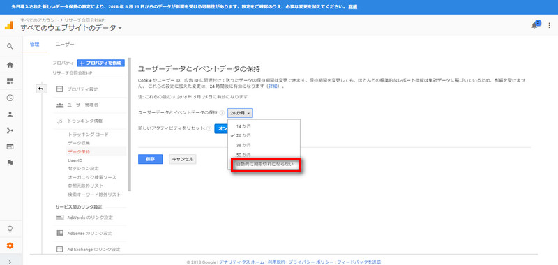 「先日導入された新しいデータ保持の設定により、2018年5月25日からのデータが影響を受ける可能性があります。設定をご確認のうえ、必要な変更を加えてください。」
