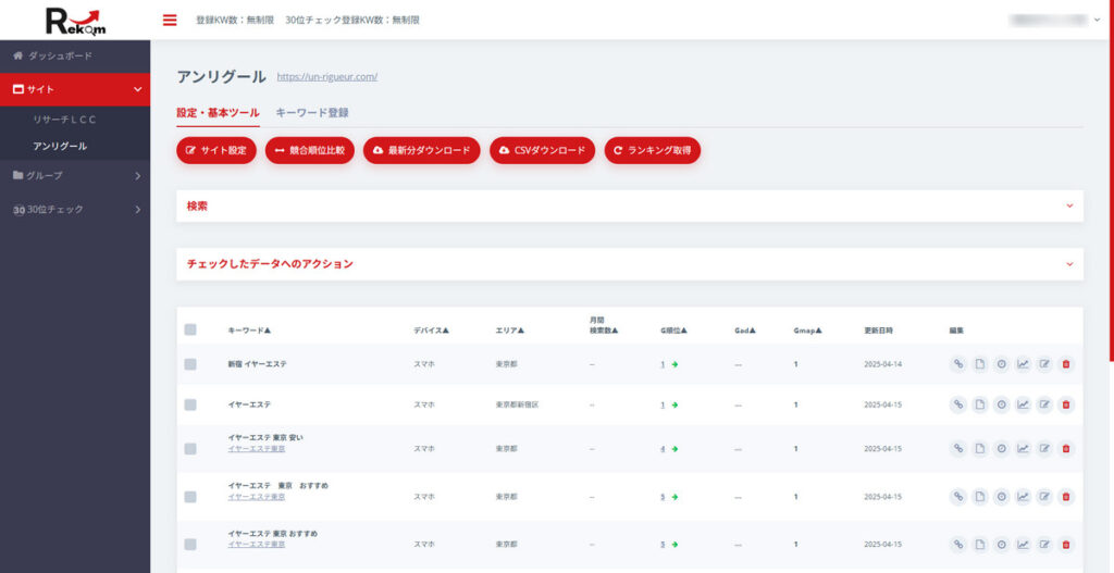 Rekamは、GoogleやYahoo!の各検索順位を調査し記録してくれるアプリケーションツールになります。