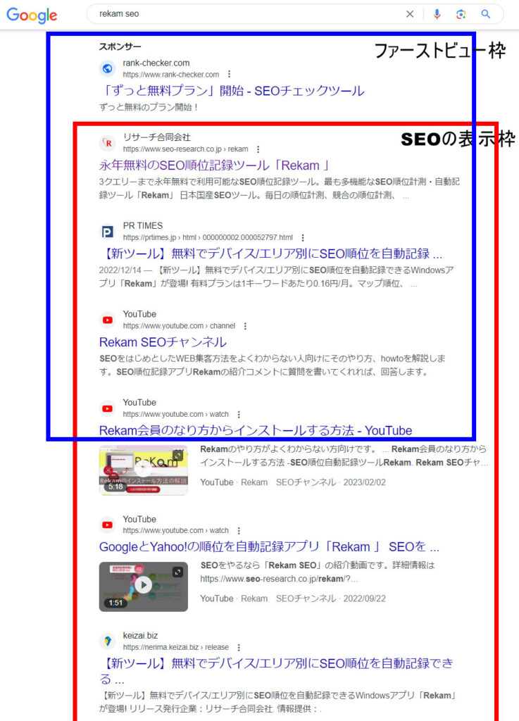 まずSEOとは主にGoogleやYahoo!の検索結果画面に表示させることです。この際に図にある赤枠部分がSEOの表示エリアになります。